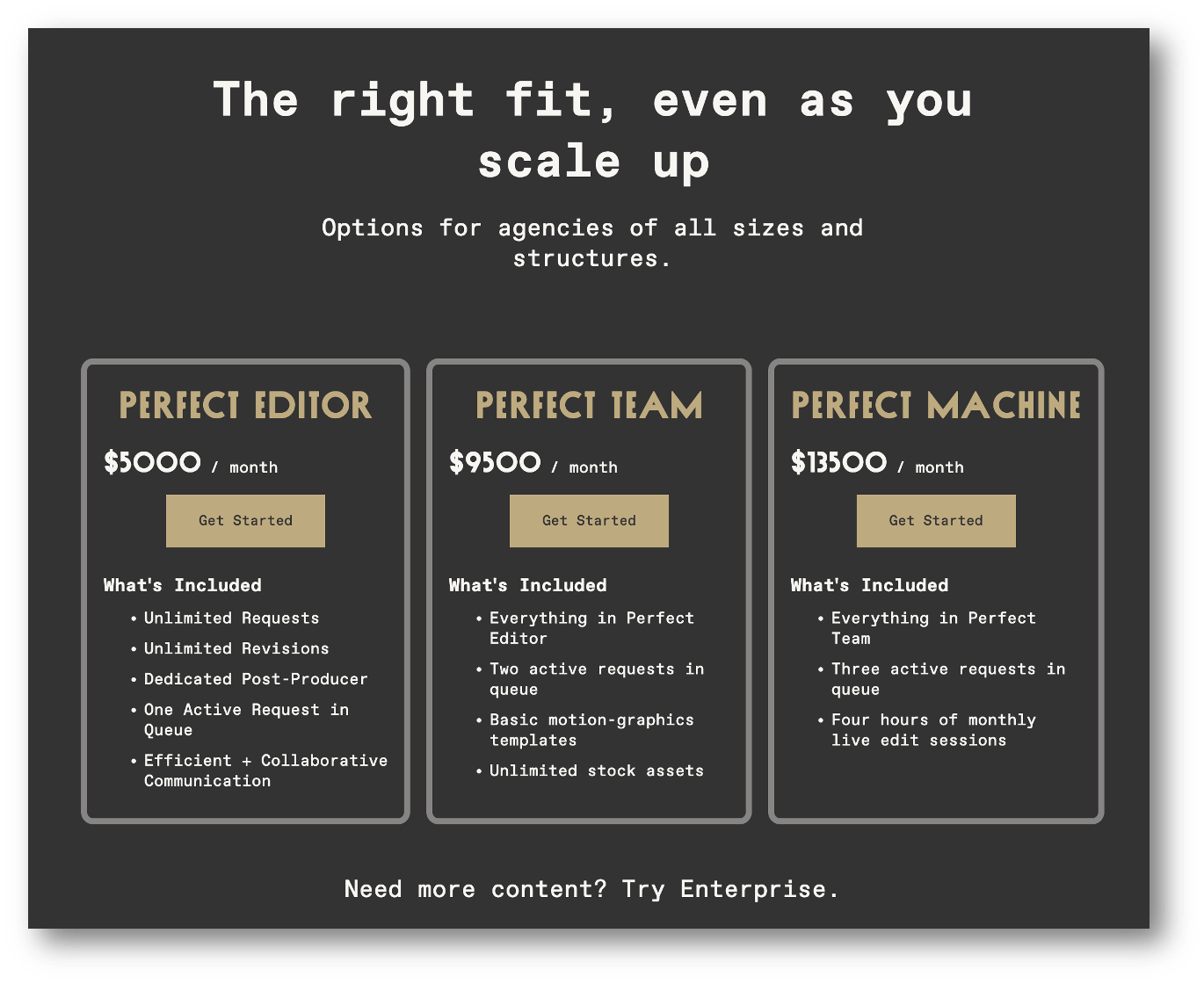 Their tiered subscription model goes from basic to high-touch as you climb each tier to get to their live edit sessions. It offers a good blend of standardization and customization.