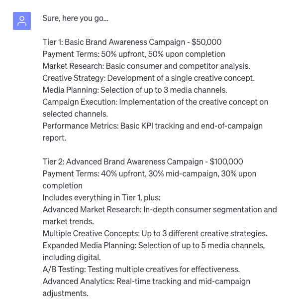 To provide an example, I asked GPT to create three productized tiers of service an agency might offer for brand awareness campaign work. Here’s what it created, which I put into table format for presentation.