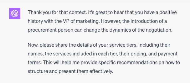 It will ask up to five questions to learn how it should provide advice. One will be about the buyer's business. Another will be about the buyer’s behaviors, comments, or questions to assess who they are and how to negotiate. Another will ask for the agency's tiers of service and the pricing and payment terms the agency is proposing. If you plan to use this prompt, have this information ready. If you want to test the prompt without this, you can make it up as you go or ask GPT to propose something for you as a hypothetical situation.