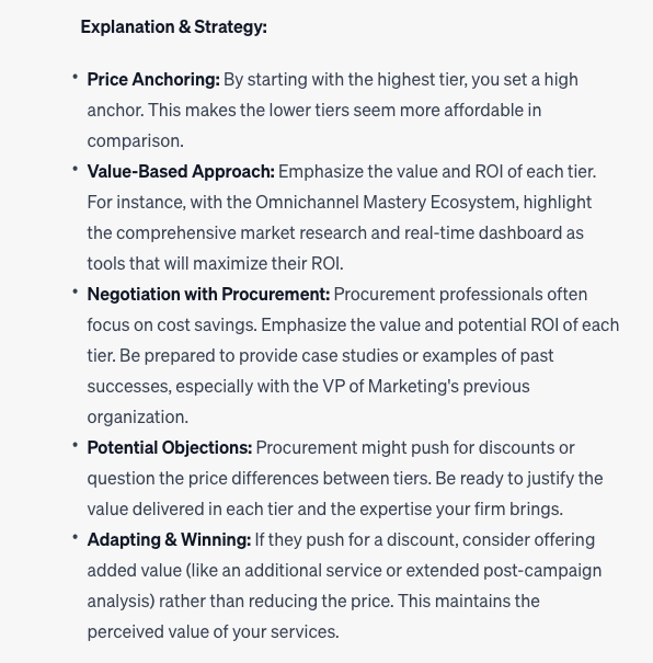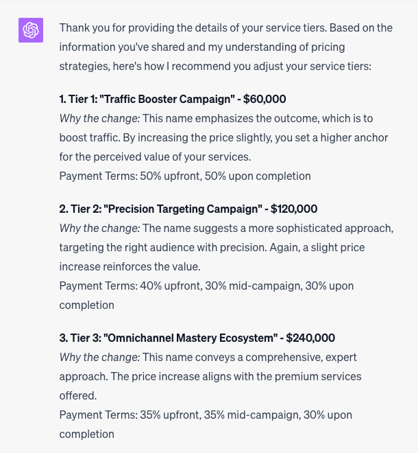 There are many other benefits to using a tiered pricing structure, but I think I’ve shared just enough to demonstrate how the ChatGPT prompt works.