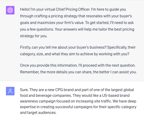 That's why I designed a ChatGPT prompt that turns GPT into an expert pricing strategist and negotiator for agencies--a virtual Chief Pricing Officer if you will.