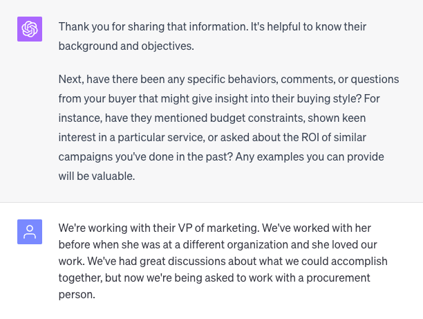 Agencies should be prepared to adjust their selling style to appeal to their buyer’s motivations to gain an edge when pricing and negotiating. In my prompt, I ask GPT to ask about the buyer to help assess who they are in terms of the following: their likely motivations, tactics they’ll use, the strategy I should use to negotiate, how to negotiate if I'm using a value-based approach, the potential objections I should expect, and how to adapt and win.